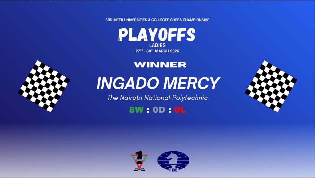 Mercy Ingado from Kenya swept the field at The Kenyan University Championships. She won all 8 games bagged home 27 rating points and had a 2269 performance. With this important win she also qualified for the Commonwealth Chess Championships in Sri Lanka in May where she will be representing Kenya. Congratulations champ and good luck in Sri Lanka.